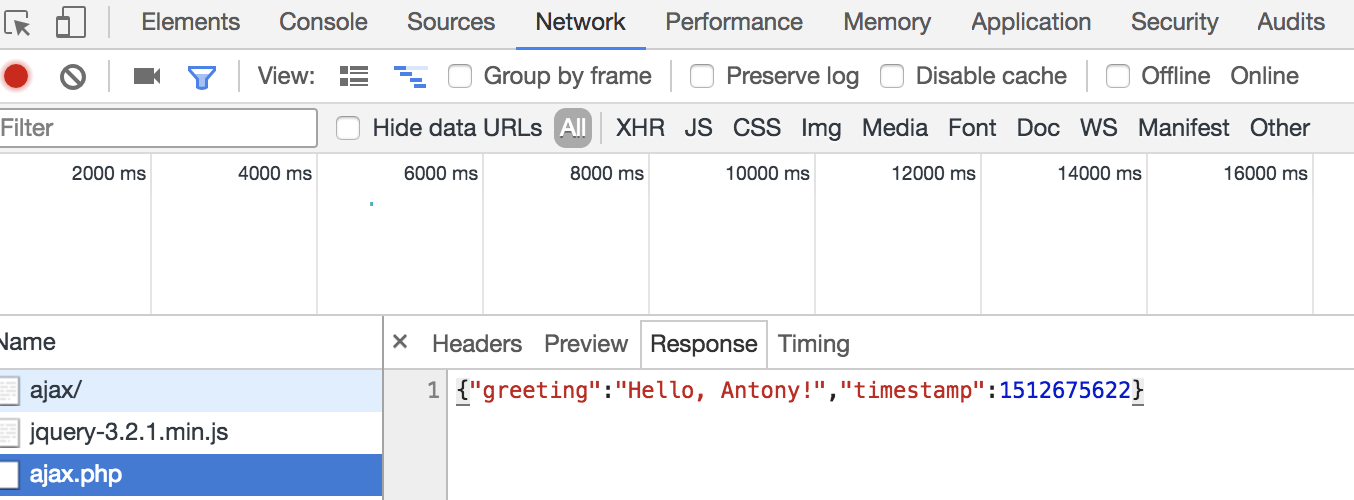 $('#response').html(json.timestamp + ': ' + json.greeting);