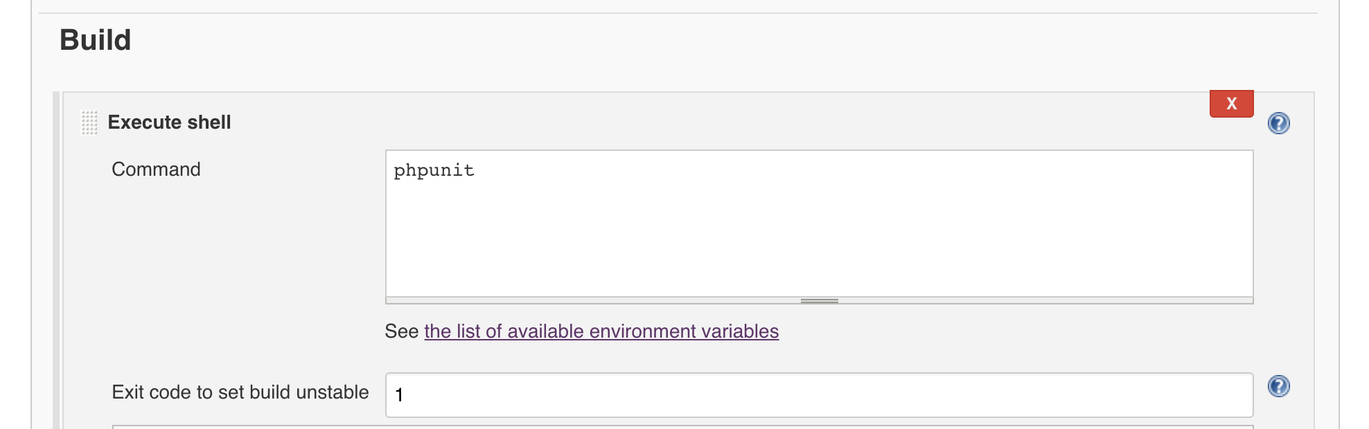 The exit code I have set is 1. What this setting means, is that if the shell command gives that code, it will mark the build as failed. In our case, we want to mark it as a failure if any of the unit tests fail. PHPUnit returns an exit code of '1' when any test fails, so that is what we use here.