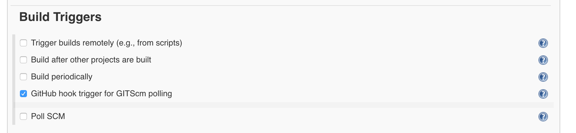 Selecting Poll will give you and box to say how often you want to Poll GitHub. Leave this blank as we are using the hook trigger. You can go ahead and save this new configuration.