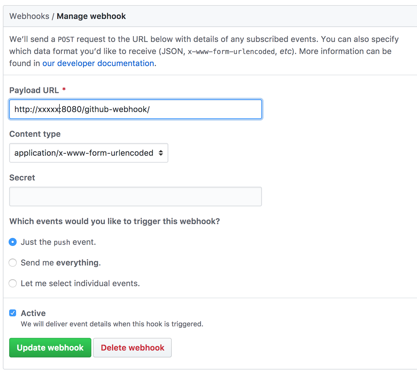 Next we have to go onto the GitHub project settings and add a new webhook. This is will push an event to the specified URL each time the repository receives pushed code. The job on Jenkins was set up to watch the master branch only so only pushes to this branch will actually be acted on.