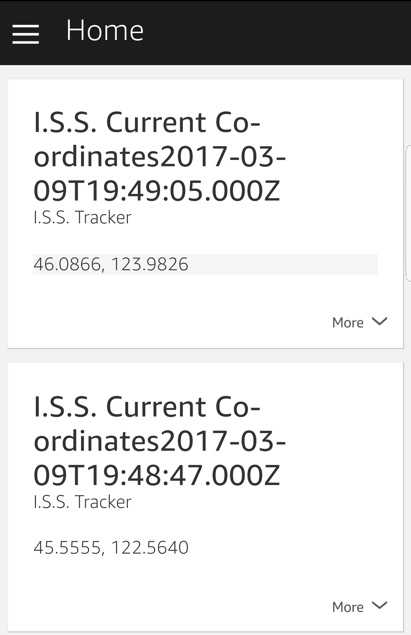I am also going to use this open api for getting the location of the ISS at a given time. Example of its output:
