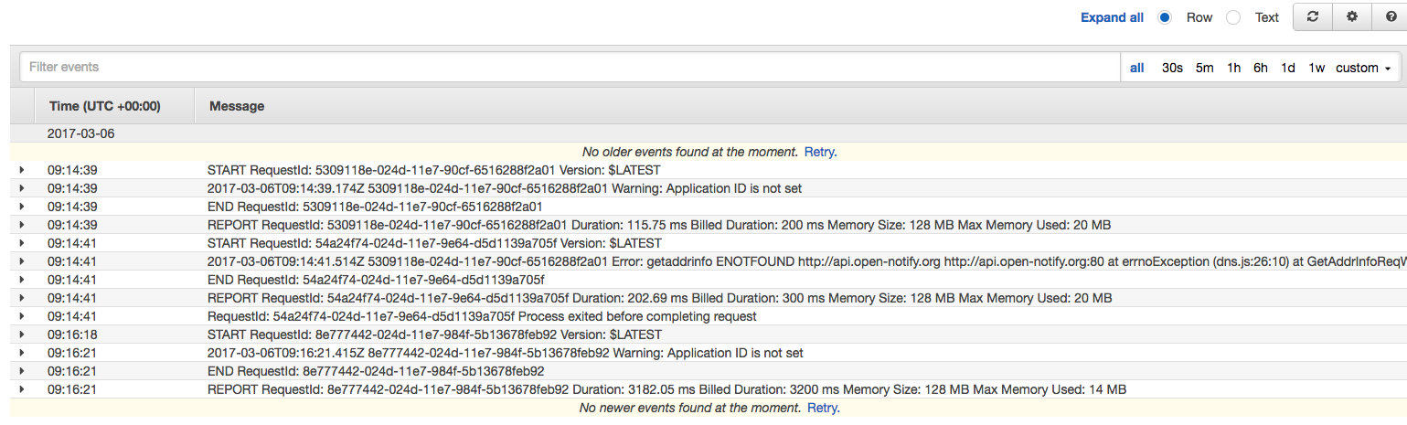 Click that, and you will be taken to where the logs are collated in CloudWatch. Each time you run the Skill from the other tab, logs will appear here:
