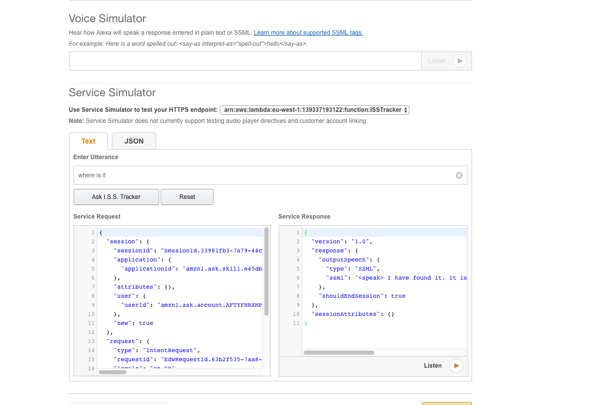 - The user won't actually say "GetLocation", this is there just to match it to the Intent. They would say: "Alexa, ask I.S.S. Tracker where is the I.S.S. right now?". So imagine each utterence being preceded with that.