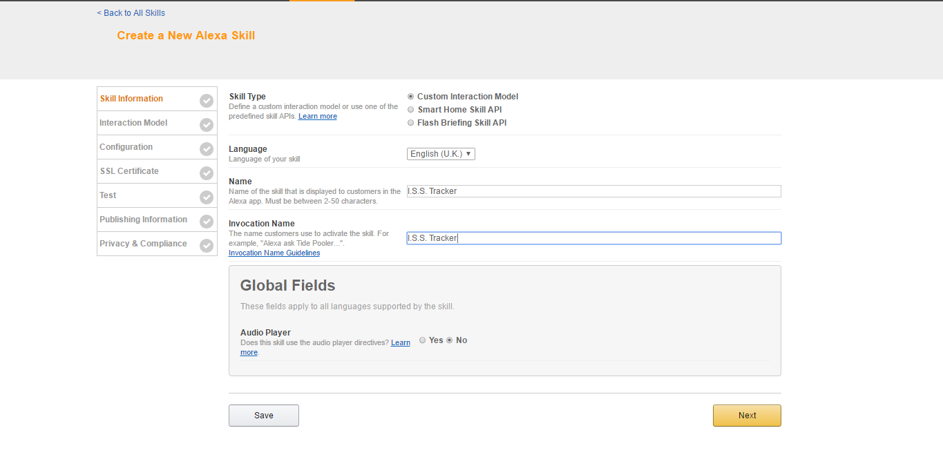 Invocation Name is a little more interesting. This is the name that you will say when you say "Alexa, ask app, 'x'". I want it to be "I.S.S. Tracker", such that it is pronounced, "eye ess ess tracker". Abbreviations marked out properly with the .s will be treated like this. If I simply put "ISS Tracker", then I would have to pronounce it "iss tracker".