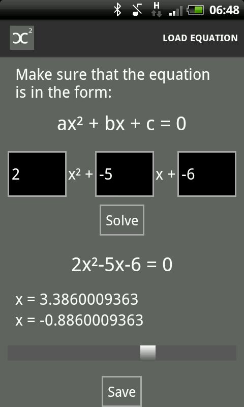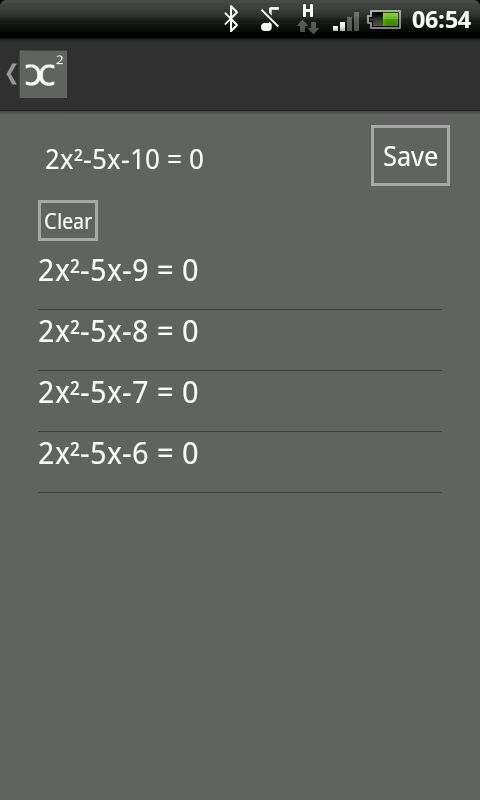 Above is the load screen. If the current solved equation hasn’t already been saved, you will be given the option to save it. You can load an equation by simply tapping the one that you want.