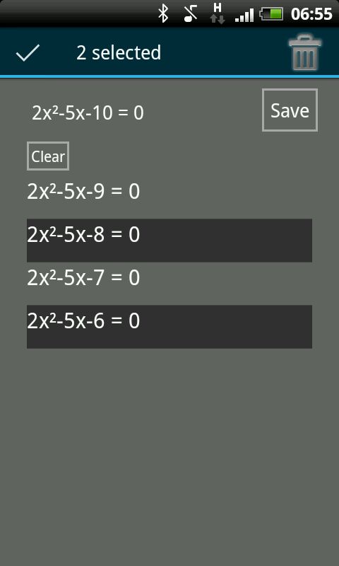 Long pressing an equation allows you to select multiple entries to delete. You can also use the clear button to delete them all. This was the hardest feature for me to implement!